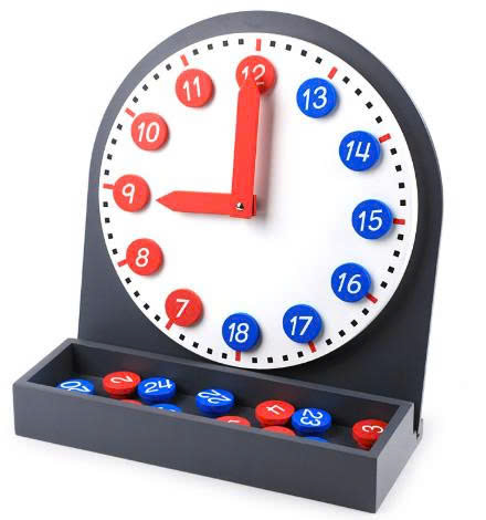 Đồng hồ tự do có tay di chuyển và các số đồng hồ có thể tháo rời 1-12 màu đỏ và 13-24 màu xanh lam được sử dụng để dạy trẻ em biết thời gian