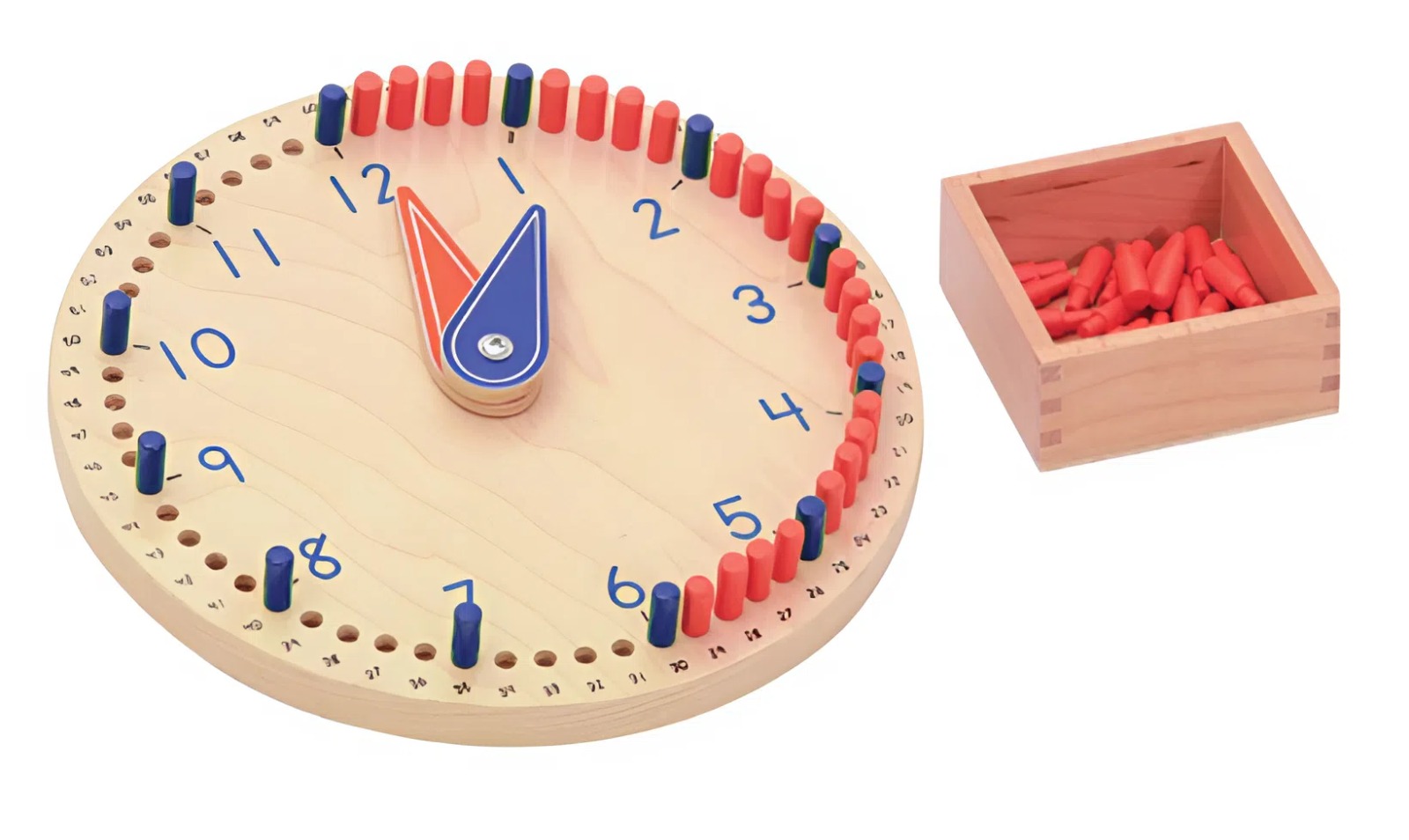 Giáo cụ đồng hồ 60 phút bằng chốt cắm giúp trẻ biết chỉnh kim theo giờ đúng trong thẻ mẫu. Biết quy tắc hoạt động của đồng hồ. Các mốc thời gian và cách đọc chúng ra sao.