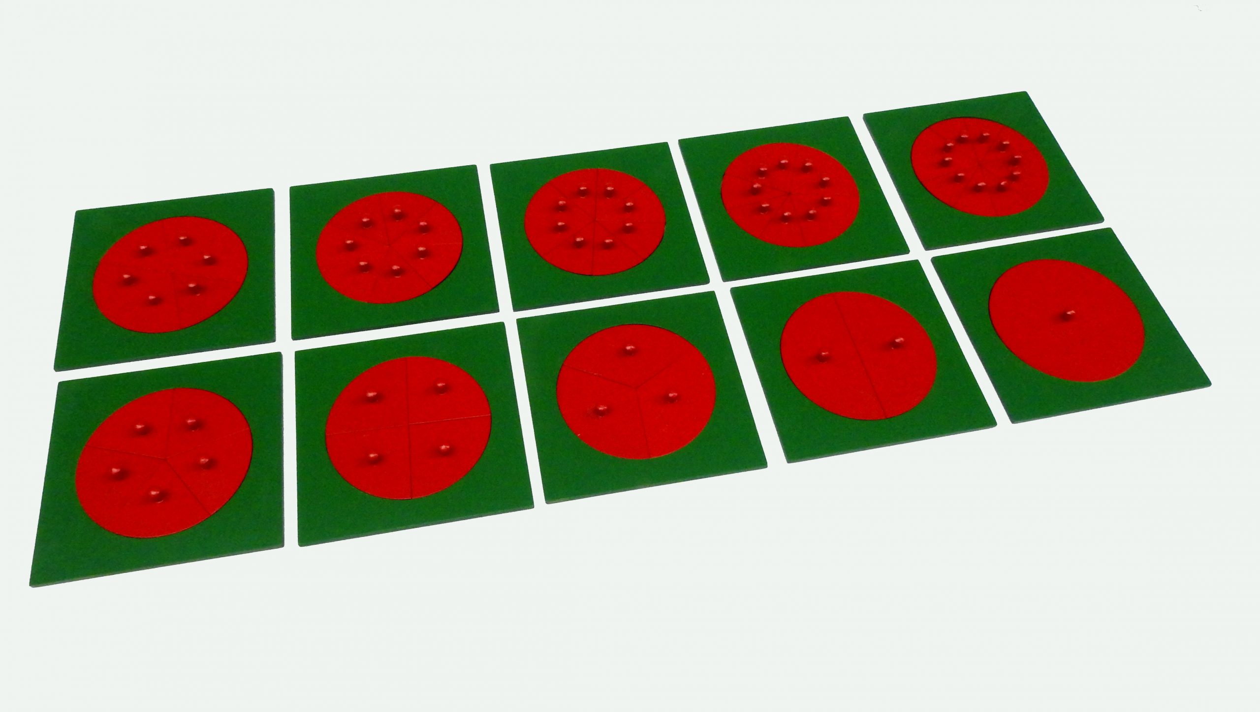• Bộ vòng tròn phân số bằng gỗ gồm 10 đế được đặt trên giá đỡ. Mỗi đế có một mảnh ghép phân số mô tả một hình tròn đầy đủ, 2 nửa hình tròn, hình tròn chia làm 3 phần, v.v., cho đến 1/10.