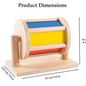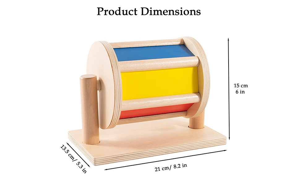 * CHƠI & KHÁM PHÁ – Thu hút bé vào thế giới khám phá với chiếc trống Montessori xoay tròn rực rỡ này. Chiếc trống nhiều màu sắc này thể hiện một cầu vồng 5 sắc thái mê hoặc và một chiếc gương khi nó xoay tròn dưới sự chạm nhẹ của bé. Bên trong, hai chiếc chuông nhỏ tạo ra âm thanh du dương khi trống quay.